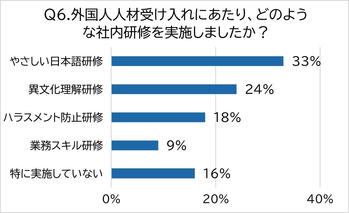 次に回答を集めたのは「異文化理解研修」(24%)で、「ハラスメント防止研修」(18%)、「業務スキル研修」(9%)が続きます。日本と外国では文化が異なるため、無意識のうちにハラスメントをしてしまわないように注意が必要です。
