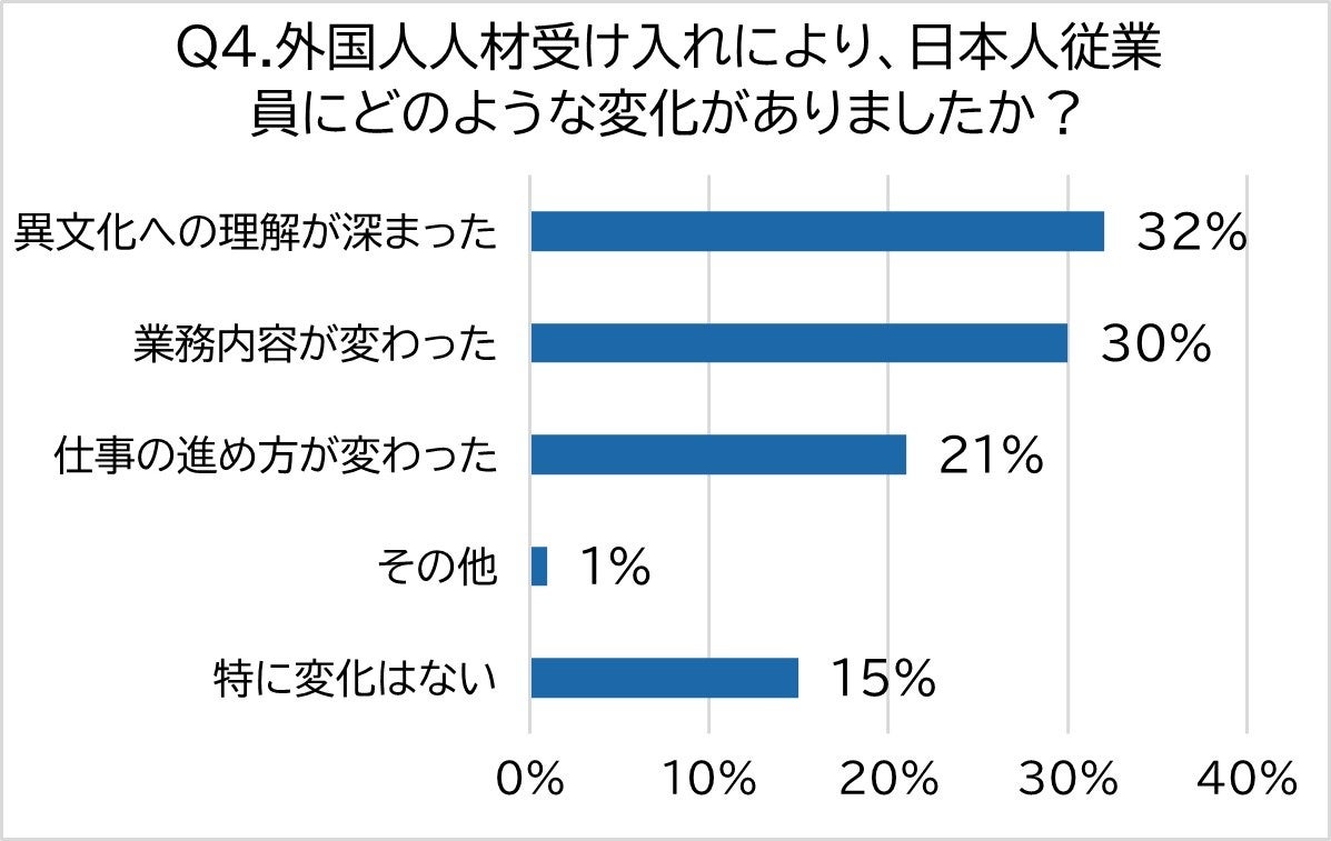 外国人人材の受け入れで日本人従業員にもたらされた変化として、最も多い回答は「異文化への理解が深まった」(32%)でした。異文化の理解が深まることは、ダイバーシティ(多様性)の促進にも繋がるため、新たなビジネスアイデアの創出や企業イメージの向上といったメリットも期待できます。