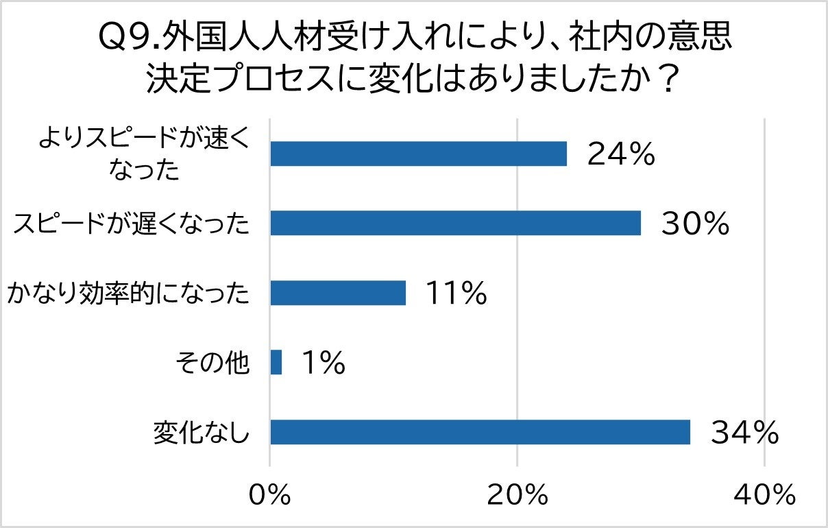外国人人材の受入れによって意思決定プロセスが向上したかという設問に対しては、「よりスピードが速くなった」(24%)、「かなり効率的になった」(11%)という好意的な回答が寄せられました。