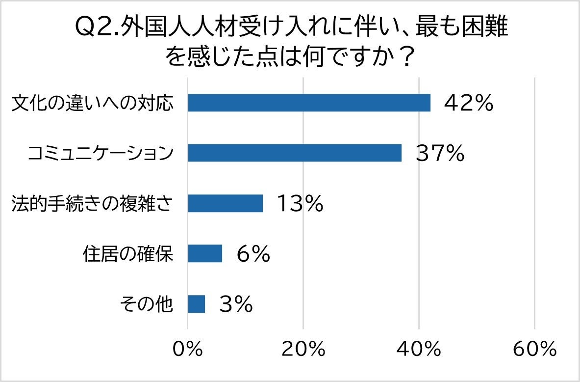 また、「法的手続きの複雑さ」(13%)や「住居の確保」(6%)に困難を感じたという人もいます。一般に、外国人人材を受入れる際は、在留資格の申請や住居の選定・契約に関するサポートなども行う必要があるため、これらの対応を負担に感じているケースもあるようです。