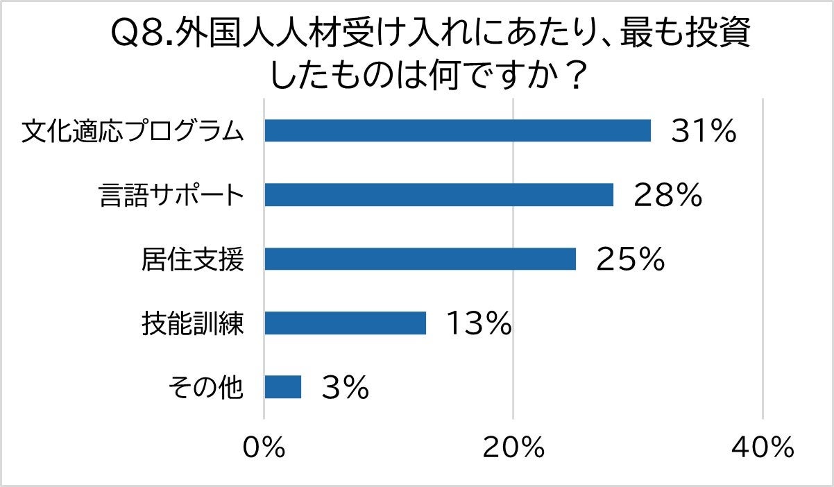 また、「言語サポート」(28%)や「居住支援」(25%)、「技能訓練」(13%)に投資したという意見も見られます。いずれの投資内容も、外国人人材が日本で就労するうえで重要性の高いものといえるでしょう。