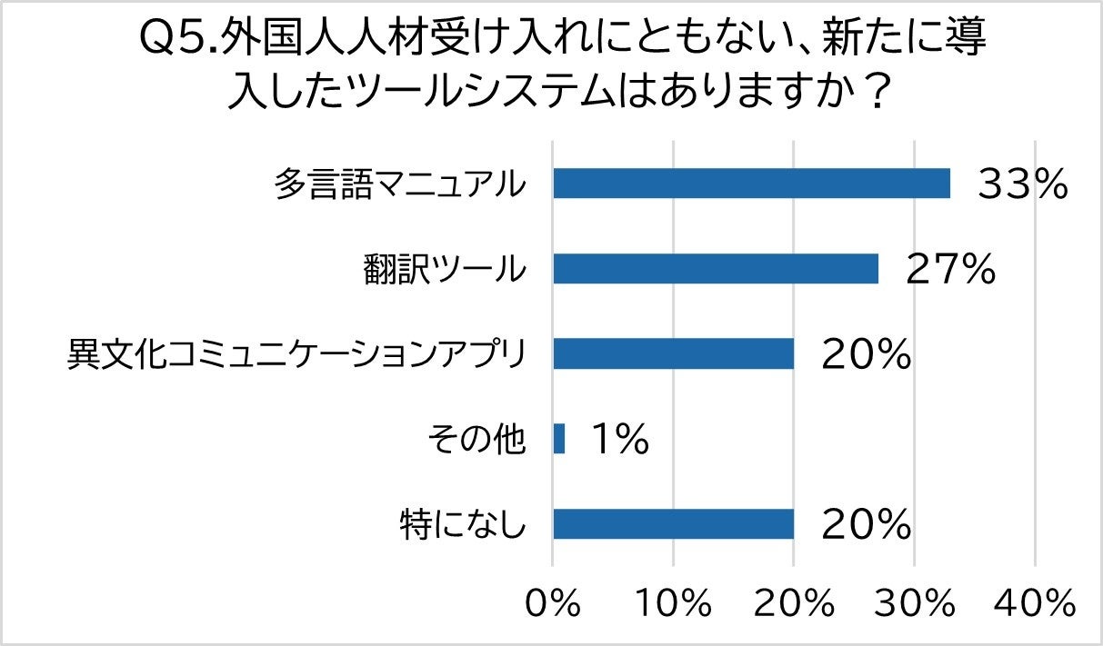 また、「異文化コミュニケーションアプリ」(20%)を導入したという声も上がっています。これらの結果から、外国人人材とスムーズにコミュニケーションを図るための準備に、多くの企業が取り組んでいることがうかがえます。