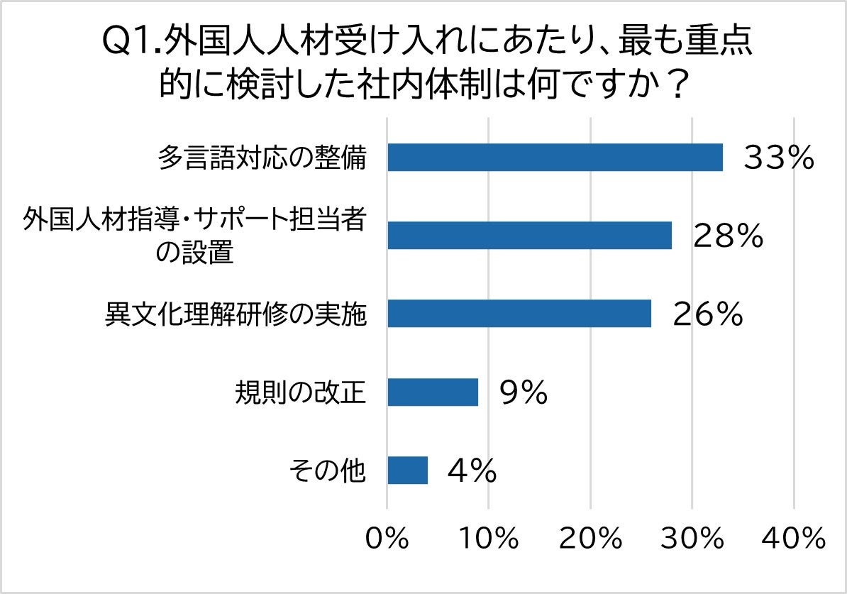 外国人人材の受入れで重点的に検討した社内体制として、最も回答が集まったのは「多言語対応の整備」(33%)です。次いで「外国人材指導・サポート担当者の設置」(28%)、「異文化理解研修の実施」(26%)となっています。これらの結果から、受入れる外国人人材の国籍に応じた、きめ細やかなサポート体制の構築が不可欠であると感じている人が多いことがわかります。
