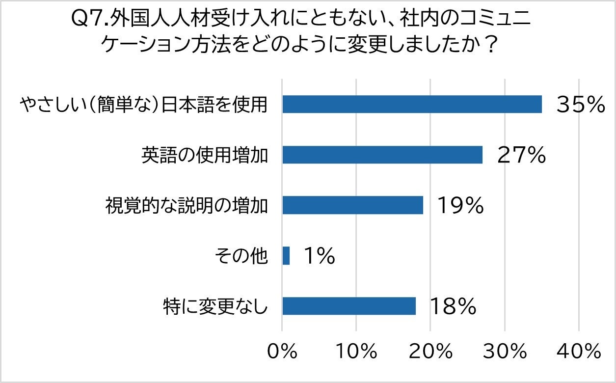 外国人人材の受入れにともなって変更したコミュニケーション方法として、「やさしい(簡単な)日本語を使用」(35%)という回答が最も多い結果となりました。また、「英語の使用増加」(27%)や「視覚的な説明の増加」(19%)という回答も上位を占めています。