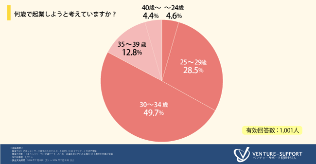 3割が20代での起業を考えており、30代前半までに起業を考えている人も含めると全体の8割となった。今回の調査では、30~34歳での起業を考えている人が約半数に上ることが明らかとなった。