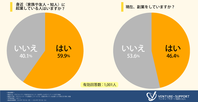 約6割が、身近(家族や友人・知人)に起業している人が「いる」と回答。半数近くが「副業をしている」