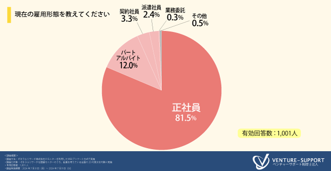 ・正社員:81.5% ・パート・アルバイト:12.0% ・契約社員:3.3% ・派遣社員:2.4% ・業務委託:0.3% ・その他:0.5% |