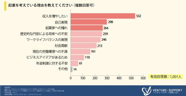 歴史的な円安、物価高に伴い、収入を増やしたいと考える人はさらに増える可能性もある。自己実現や起業家への憧れから起業を考えている人も多く、向上心の高さが窺える結果となった。