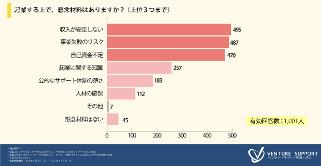 約半数が「収入が安定しない」可能性を懸念。「事業失敗のリスク」「自己資金不足」が続く
