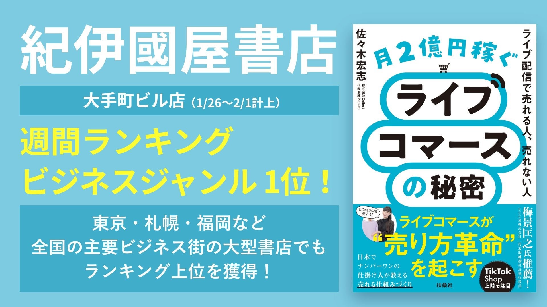 日本におけるライブコマースのインフラ化を目指す株式会社Cellest(本社:大阪府大阪市、代表取締役CEO:佐々木 宏志、以下当社)は、当社代表取締役CEO・佐々木宏志著『月2億円稼ぐライブコマースの秘密 ~ライブ配信で売れる人、売れない人~』(株式会社扶桑社)が、紀伊國屋書店 大手町ビル店のビジネスジャンルランキングで1位を獲得したことをお知らせいたします。