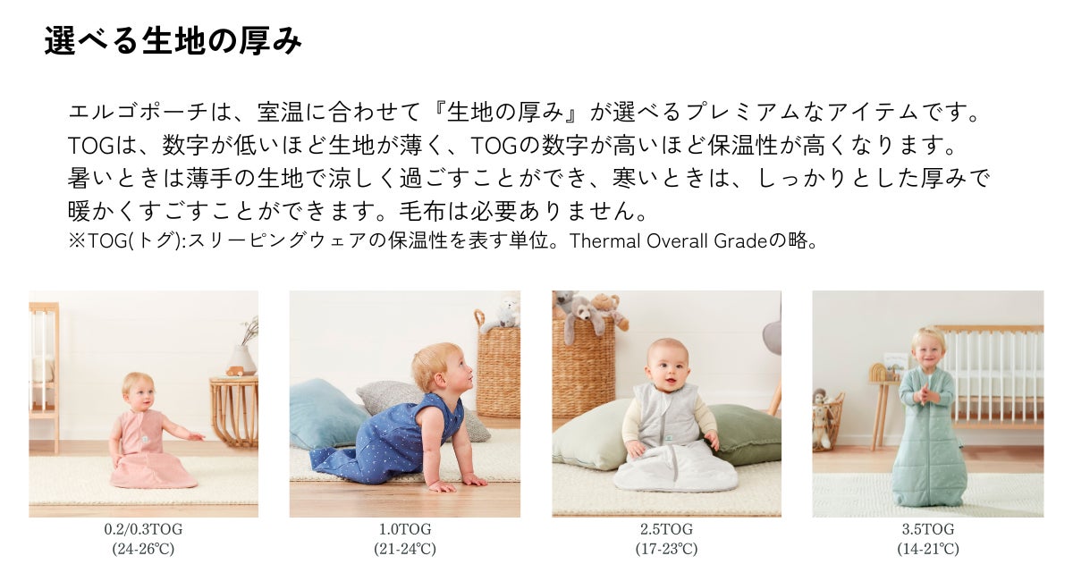 室温に合わせて生地の厚みを選べるTOG規格のアイテムは、掛け布団を使用せずに赤ちゃんが安全に眠られる環境を整えることができ、パジャマや布団がはだけてしまうお子さんの寝冷え対策としてもおすすめです。