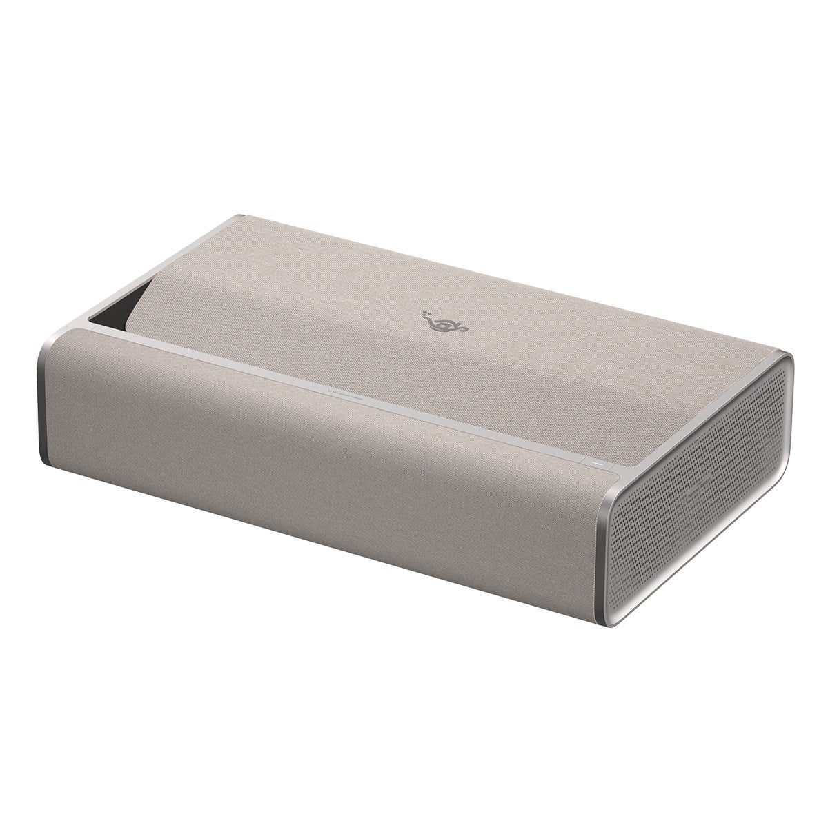 壁から24cmで100インチの大画面視聴が可能な超短焦点プロジェクター。インテリアにも溶け込むスタイリッシュなデザインでHarman Kardon製のスピーカーを搭載。投影画面のゆがみを自動的に補正する「自動台形補正機能」などの自動調整機能や最新技術デュアルライトテクノロジーの採用に加えて、Aladdin Xのオリジナルコンテンツが楽しめるAladdin OSを搭載。