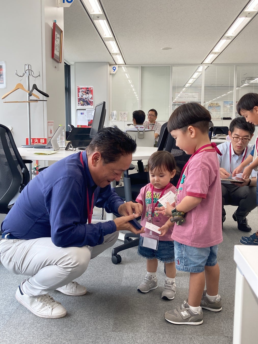 参加したのはイオンエンターテイメント本社で働く従業員の家族である1歳から18歳までの子どもたち9名。普段は見ることのない親の職場やその働く姿を目にすることで、親の仕事への理解を深め、より親しみを感じてもらう機会となりました。