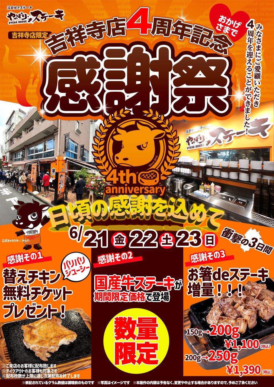 【やっぱりステーキ吉祥寺店4周年】日頃の感謝の気持ちを込めて感謝価格でお得な3日間!