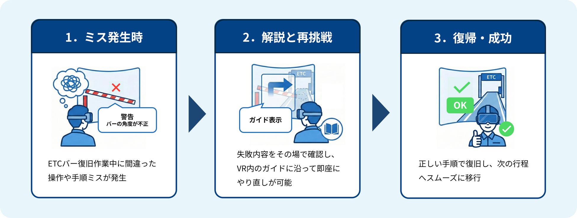 さらに、作業手順を誤った際に、その場ですぐに振り返ってやり直しできる「失敗時の即時リトライ機能」を備えました。失敗の要因を即座に確認し、ガイドに従ってその場でやり直すことで、正しい手順を効率よく習得できます。