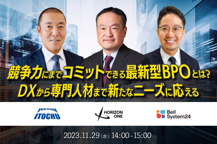 株式会社ベルシステム24(本社:東京都港区、代表取締役 社長執行役員:野田 俊介、以下:当社)は、「競争力の向上にコミットする最新BPOとは?DXから専門人材まで新たなニーズに応える」と題したオンラインセミナー(以下:本セミナー)を、11月29日(水)に開催します。