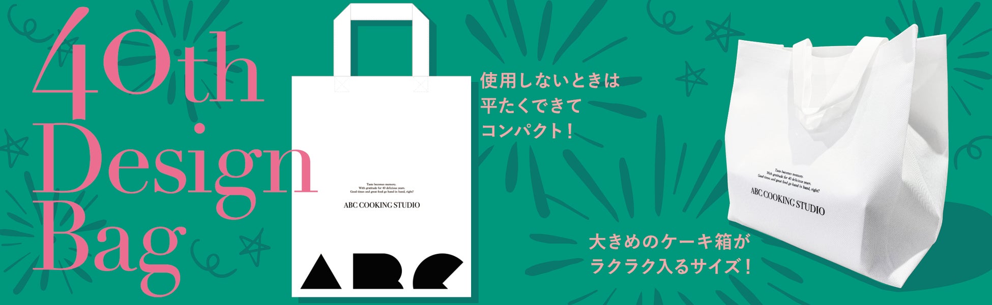 通学生のためだけの特別なプレゼントをご用意。期間中、レッスン※3 を受講された方に、各スタジオ先着順で、40周年デザインの限定バッグをプレゼント。清潔感のある白に、モダンなデザインのバッグは、マチがしっかりあって、ケーキ箱も入れられるたっぷりサイズです。レッスンのときはもちろん、普段のお買い物やピクニックにも大活躍します。