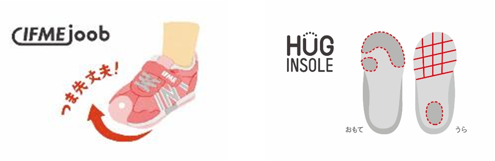 インソールにはIFME独自開発のインソール「HUG INSOLE(ハグインソール)」を使用し、かかと部分のくぼみが、足を“ハグ”するように包み込むことで、左右のブレを防ぎます。また、足先部分のくぼみが広がったことで、指先をより自由に動かすことができ、さらに、前足部分のフレックスラインで屈曲性をアップさせるなど、元気に動き回るお子様に最適なアイテムです。