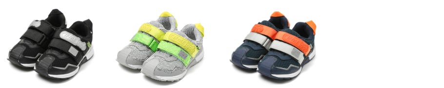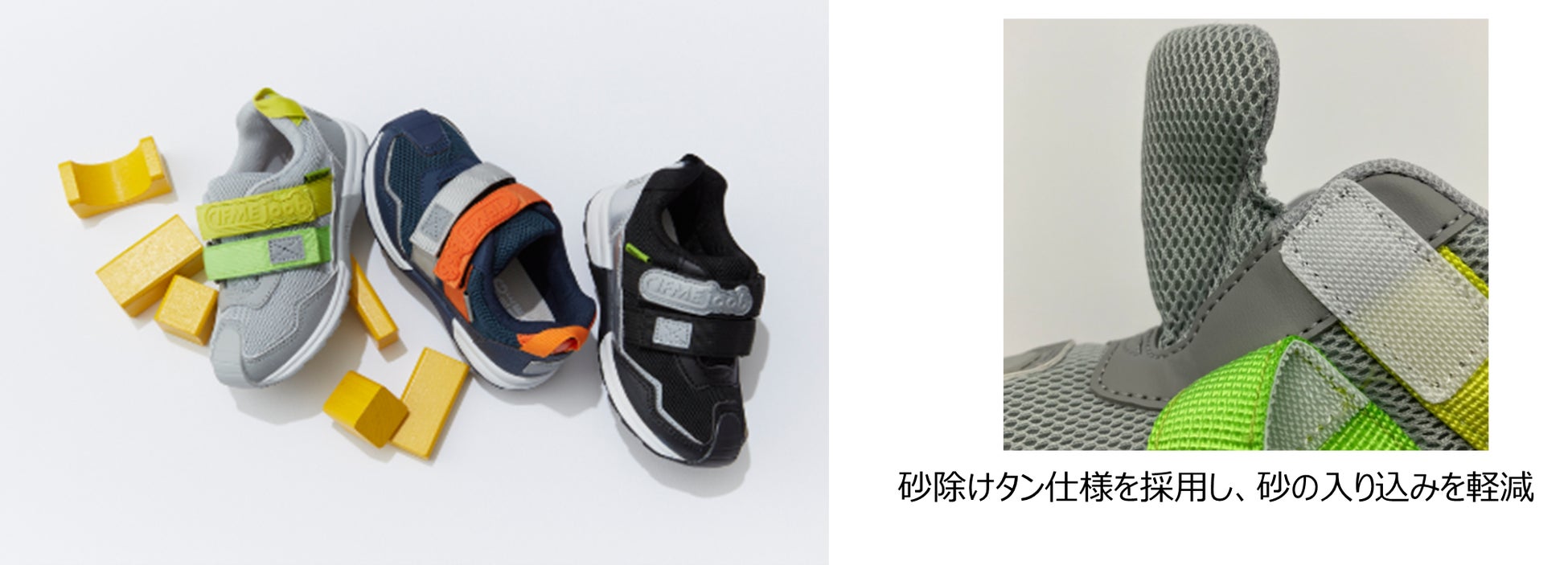 2本のベルトが特徴のスニーカー。前後のベルトをそれぞれお好みの位置で調整することでフィット感が向上し、激しい動きでも安定した履き心地を実現します。また、タンとアッパーが繋がった“砂除けタン”で、遊んでいる最中も砂が入りにくい仕様で、玄関の砂汚れも軽減してくれます。カラーは、ブラック・グレー・ネイビーの3色を展開。明るいビタミンカラーは元気な印象をプラスします。お出かけや外遊びに最適な、これからの季節にぴったりな一足です。