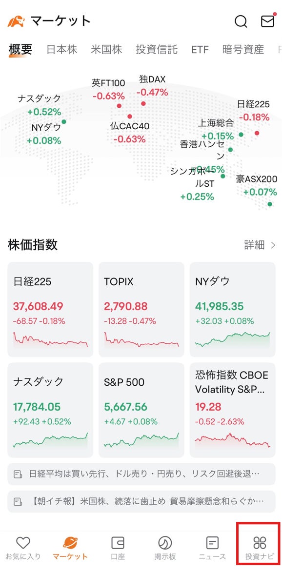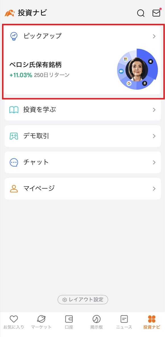 ①「投資ナビ」 をタップ ―> ②「ピックアップ」をタップ