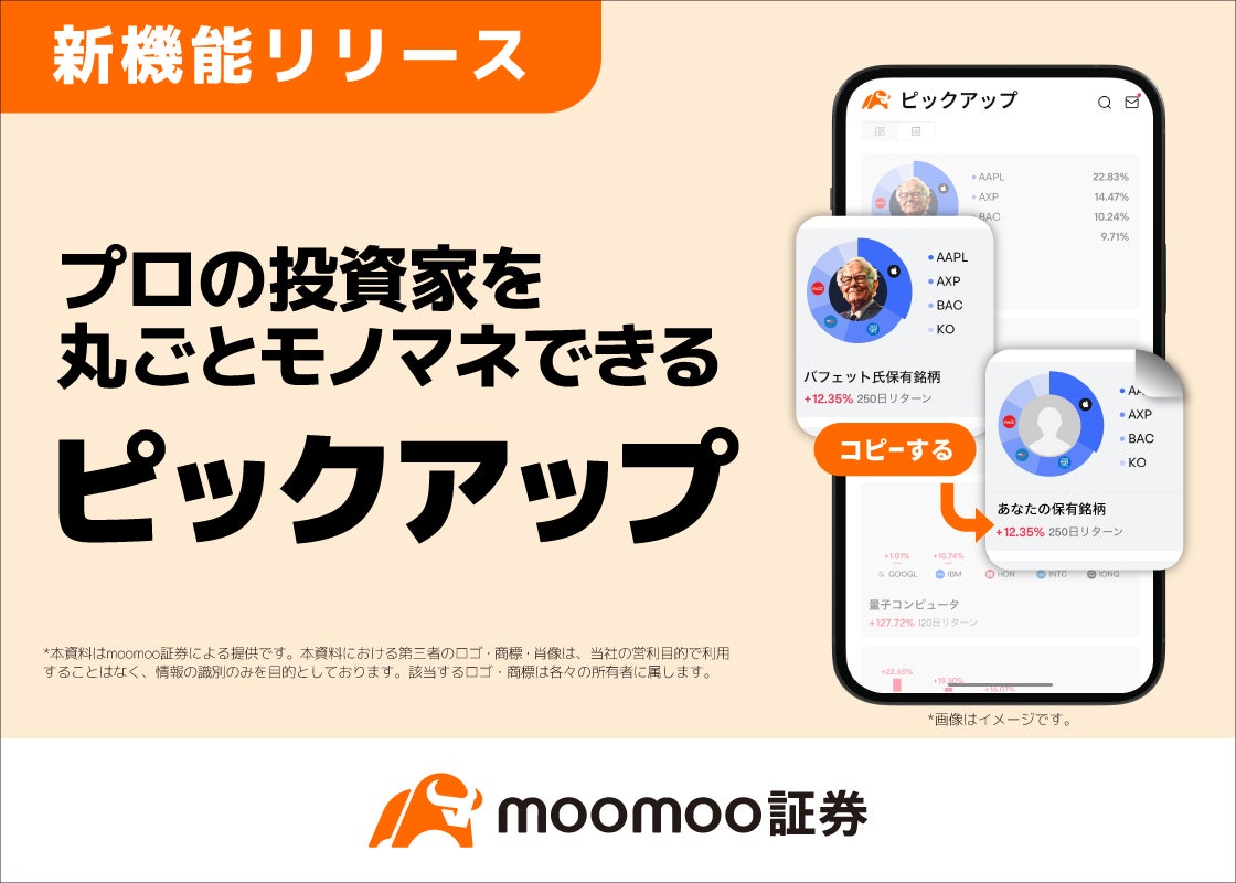 次世代投資アプリを提供するmoomoo証券株式会社(ムームー、本社:東京都渋谷区、代表取締役社長:伊澤フランシスコ、以下「moomoo証券」)はこの度、機関投資家のポートフォリオを真似て投資できる「ピックアップ」サービスを無料で開始いたしました。話題の資産運用会社のポートフォリオを、簡単にコピペで真似て投資することが可能となります。