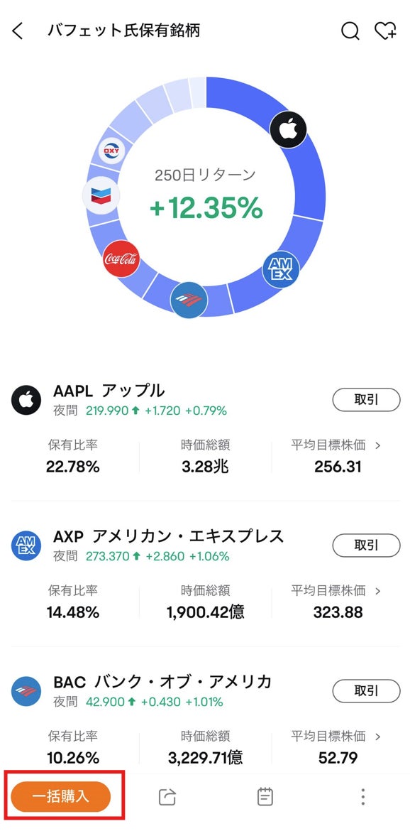 ③気になる個別ポートフォリオ保有銘柄をタップ ー> ④「一括購入」でモノマネ投資