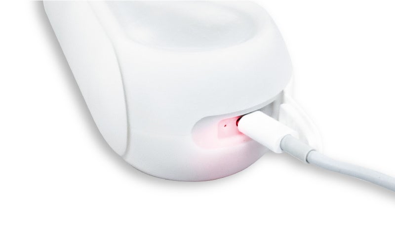 幅135×奥行50×高さ70mm。USB充電式。約2.5時間の充電で約30分稼働。