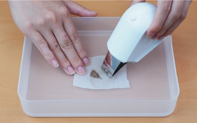 しみ抜きを行う衣類に水を浸し。本製品の先端の超音波ブレードを当てながらなぞればOK。約2.3cm幅の2枚のブレードが1秒間に約2.5万回振動し、汚れを効率よく除去。