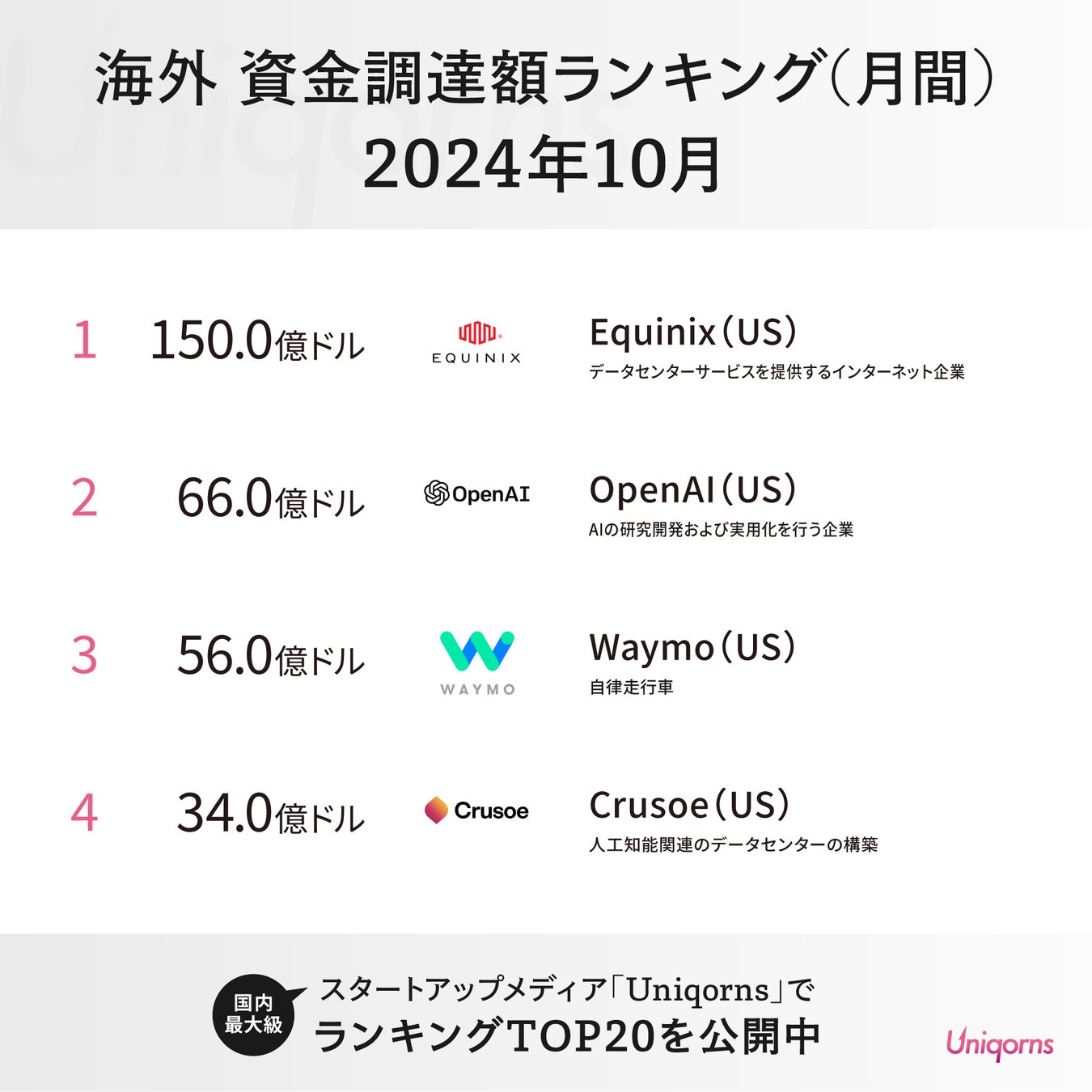 国内最大級のスタートアップメディア「Uniqorns(ユニコーンズ)」が2024年10月の海外スタートアップ資金調達状況をランキング形式で発表