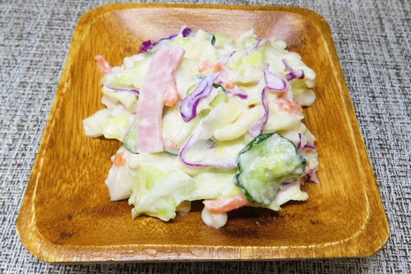 九州産春キャベツ、マカロニ、きゅうり、ハム、にんじん、コーン、紫キャベツをレモンの香りがアクセントのケンコーマヨネーズ商品『レモンコールスローマヨネーズタイプ(https://www.kenkomayo.com/pro/g/g14711/)』で和えた、春にぴったりの商品です。