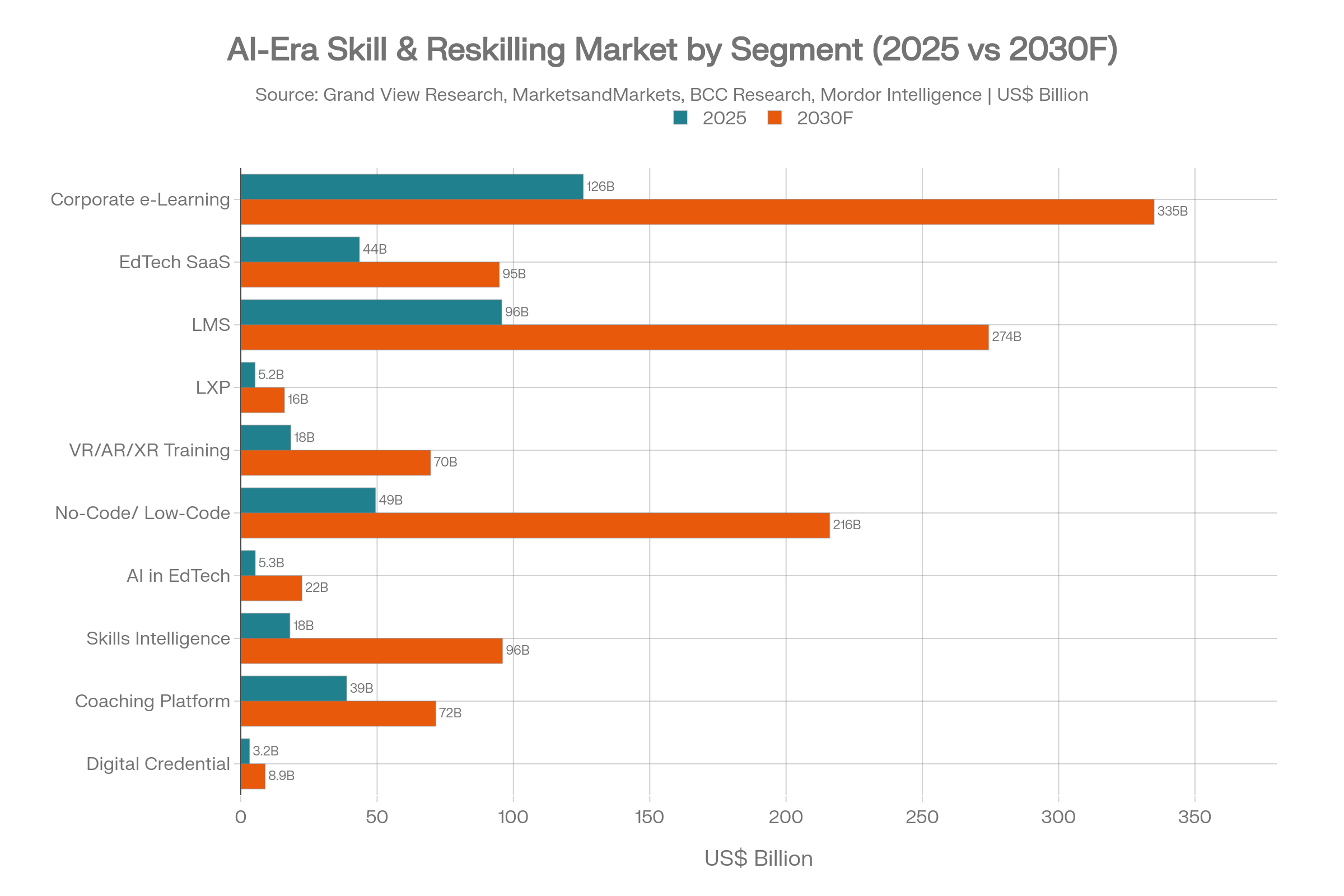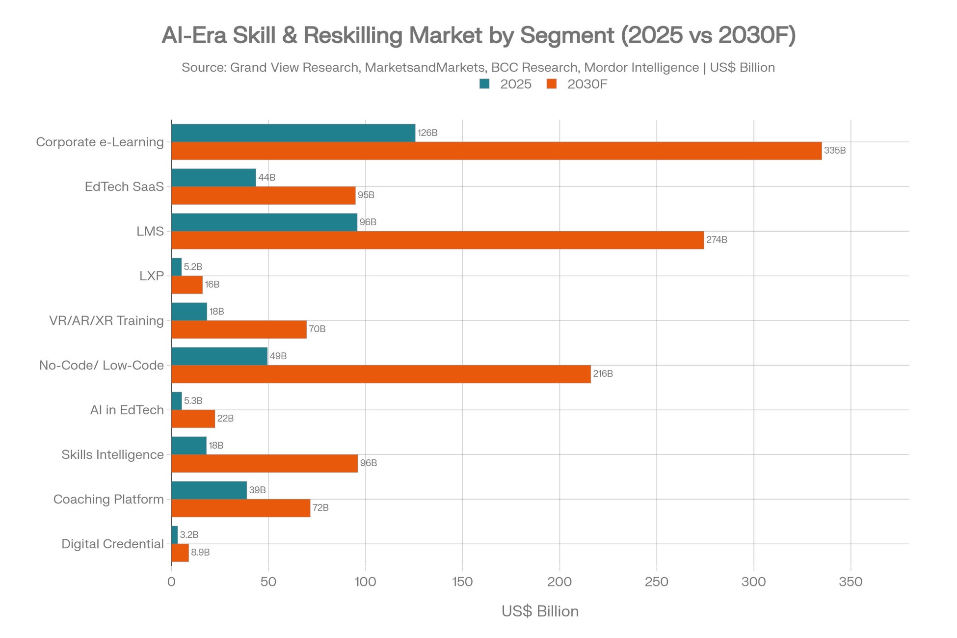 10セグメント×60テーマの市場規模・CAGR・シナリオ分析により、2026-2030年のスキル経済の全体地図を獲得する