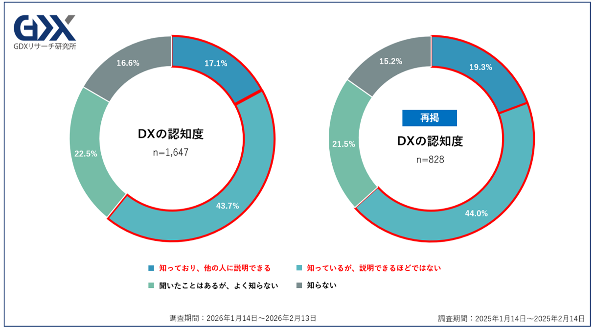 中小企業のDX認知度に関する調査結果では、最も多かった回答は「知っているが、説明できるほどではない」(43.7%)で、「知っており、他の人に説明できる」(17.1%)を合わせた認知度は60.8%となりました。これは前年同期の調査結果とほぼ変わらない水準です。一方で、約3割の企業が「よく知らない」または「知らない」と回答しており、依然としてDXが中小企業全体に浸透しているとは言えない状況です。