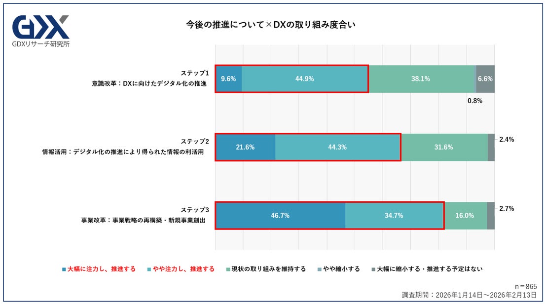 しかし、今後のDX推進につては「大幅に注力し、推進する」や「現状維持」を含め、9割を超える企業が今後も継続して取り組む意思を示しています 。特筆すべきは、取り組みのステップ(深化度)が進むほど、推進意欲が高まる傾向にある点です 。