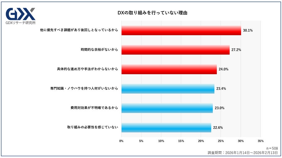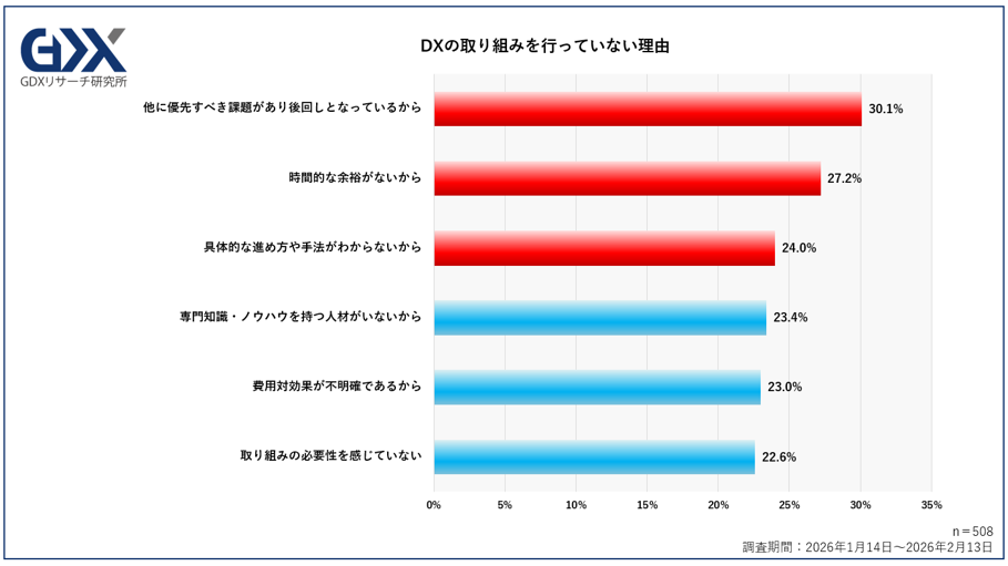 DXに取り組まない理由として最多となったのは「他に優先すべき課題があり後回しとなっているから」(回答企業中・30.1%)であり、さらに「時間的な余裕がないから」(同・27.2%)、「具体的な進め方や手法がわからないから」(同・24.0%)と続いた。優先順位や時間不足といった経営資源の制約に加え、進め方や人材面に関する課題も背景にあることがうかがえます。