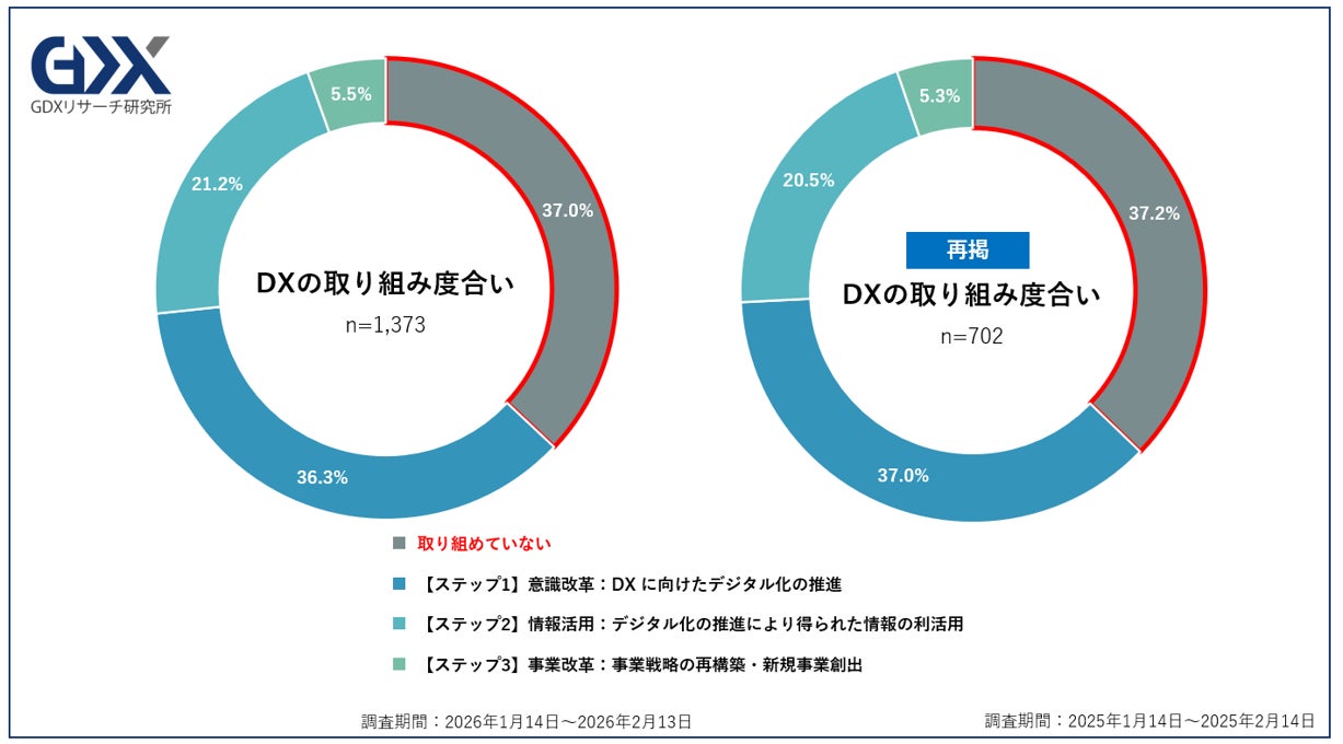 これらの結果から、DXの進捗を後押しするのは、継続的な取り組みに加え、ツールやシステムの導入そのものよりも、経営層の意思決定、事業戦略との連動、進捗管理、外部知見の活用といった推進の仕組みであることが示唆されます。まだ取り組みを行っていない企業は、今回の結果を参考に取り組みを検討してはいかがでしょう。