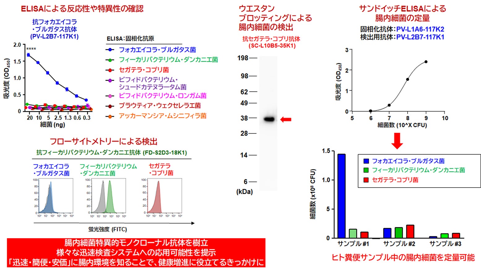 日本人に多くみられる腸内細菌3種類(セガテラ・コプリ、フィーカリバクテリウム・ダンカニエ、フォカエイコラ・ブルガタス)に対する特異的モノクローナル抗体を新たに樹立樹立した抗体は、ELISA、フローサイトメトリー、ウエスタンブロッティングなど各種検出系に適用可能サンドイッチELISAを用いて、標的細菌の培養株や糞便中に含まれる標的細菌の定量に成功