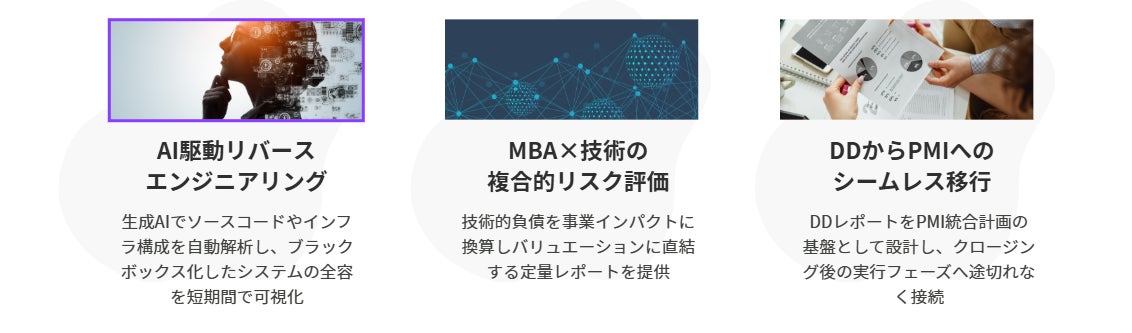 AI駆動のリバースエンジニアリングとMBA知見を融合。DDレポートからPMIまで一気通貫で支援し、ディール価値の最大化を実現