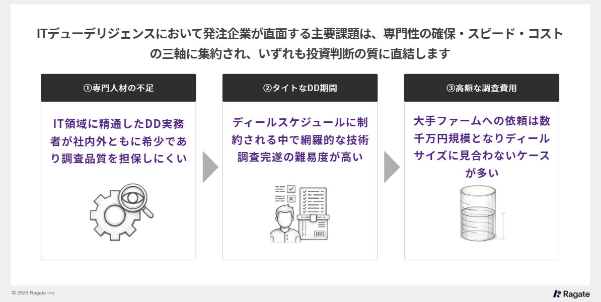 しかし、IT DDを実施・発注する側の企業が現場で直面する課題は、大きく3つの軸に集約されます。