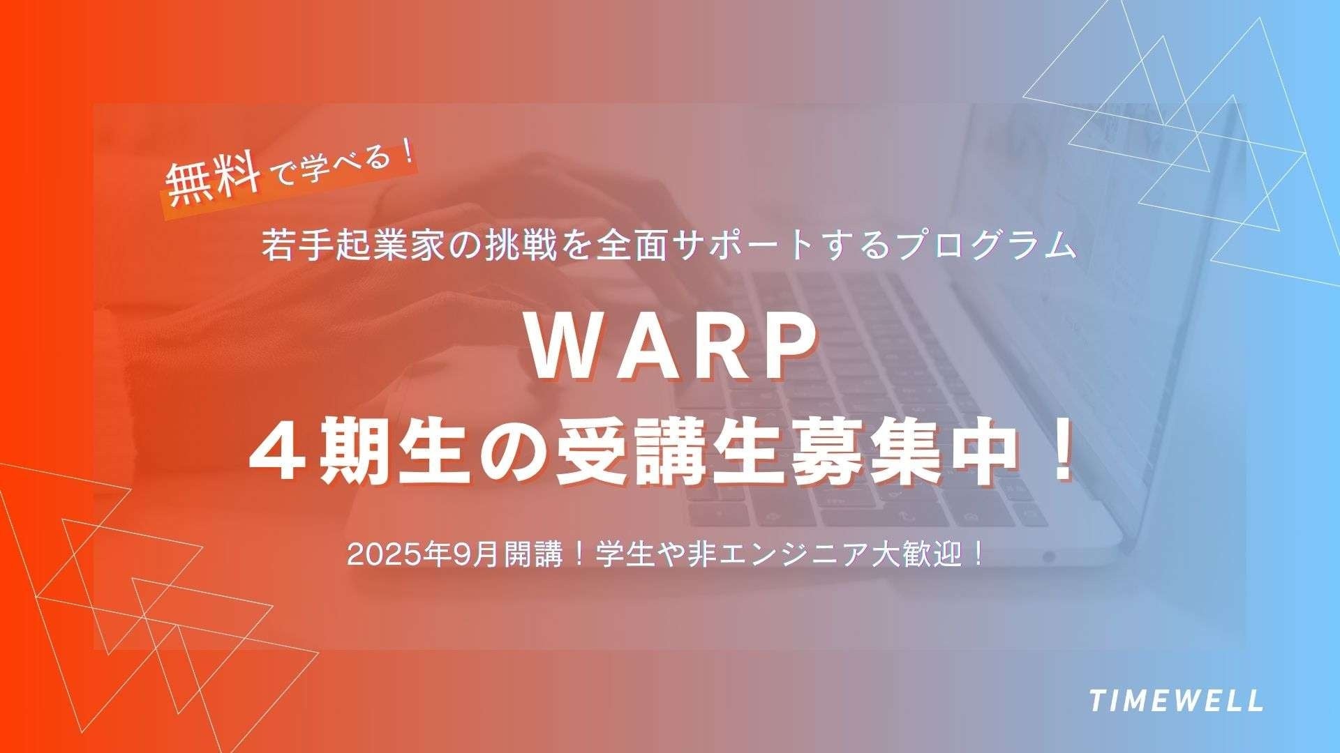 株式会社TIMEWELL(本社:神奈川県横浜市、代表取締役:濱本隆太、以下TIMEWELL)は、東京都の多様な主体によるスタートアップ支援展開事業「TOKYO SUTEAM」の協定事業者として、事業支援やアプリ開発、登記や実証実験まで、一部費用も含めてサポートし自ら開発できる、若手テクニカルアントレプレナー育成プログラム「WARP」※(以下WARP)の受講生の募集を開始します。2025年7月31日から第4期である9月開始分の受講生の募集を開始いたします。