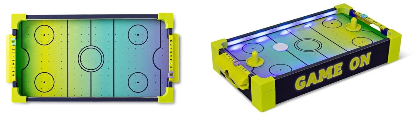 派手に光るエアホッケー!もちろんエアーが出ます。ミニだからと言って侮るなかれ!