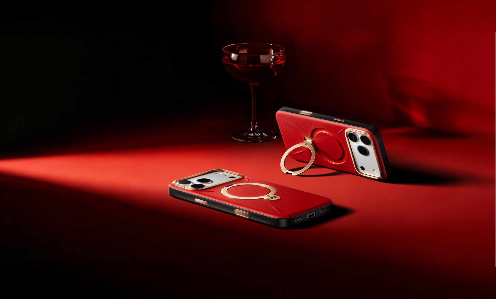 新色の「ルビー・レッド」は深みのある真紅のレザーに、ローズゴールドのメタルリングを組み合わせた気品溢れるデザイン。MagSafe対応の360°回転スタンドは、動画視聴や撮影など様々なシーンで最適な角度で固定可能です。ユニセックスでフォーマルな装いにもマッチする、上品で機能的な多機能ケースです。