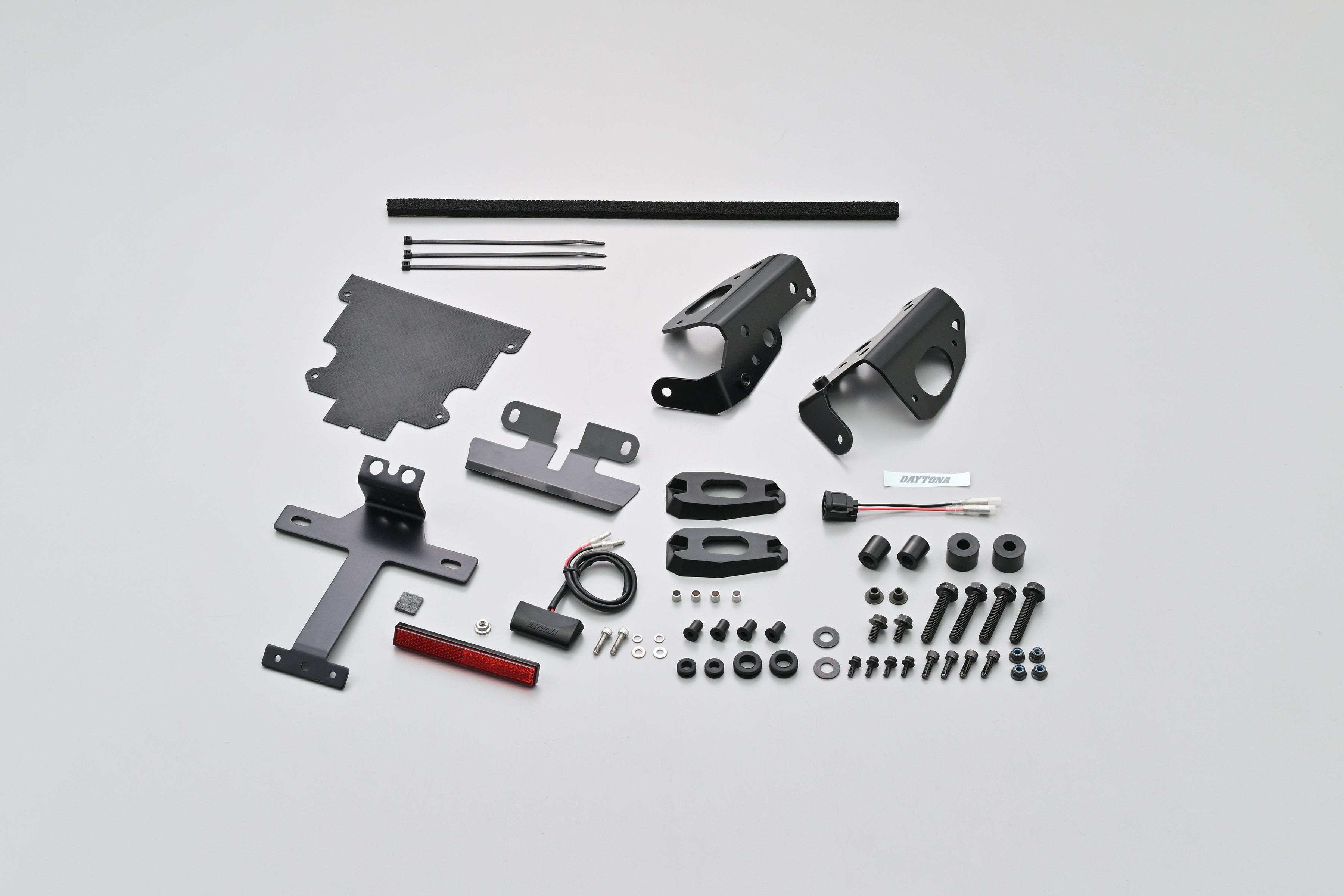 テール周りをコンパクトにまとめるフェンダーレスキットです。ウインカーは純正を移設して使用します。車検対応の小型のLEDライセンスランプ、スリムタイプのリフレクターが付属。簡単に装着できるボルトオン&カプラーオン設計です。別売のM1ウインカーベース(93393)を組み合わせることで、社外ウインカーへのカスタムも可能。※マルチウイングキャリア(62573)同時装着不可。
