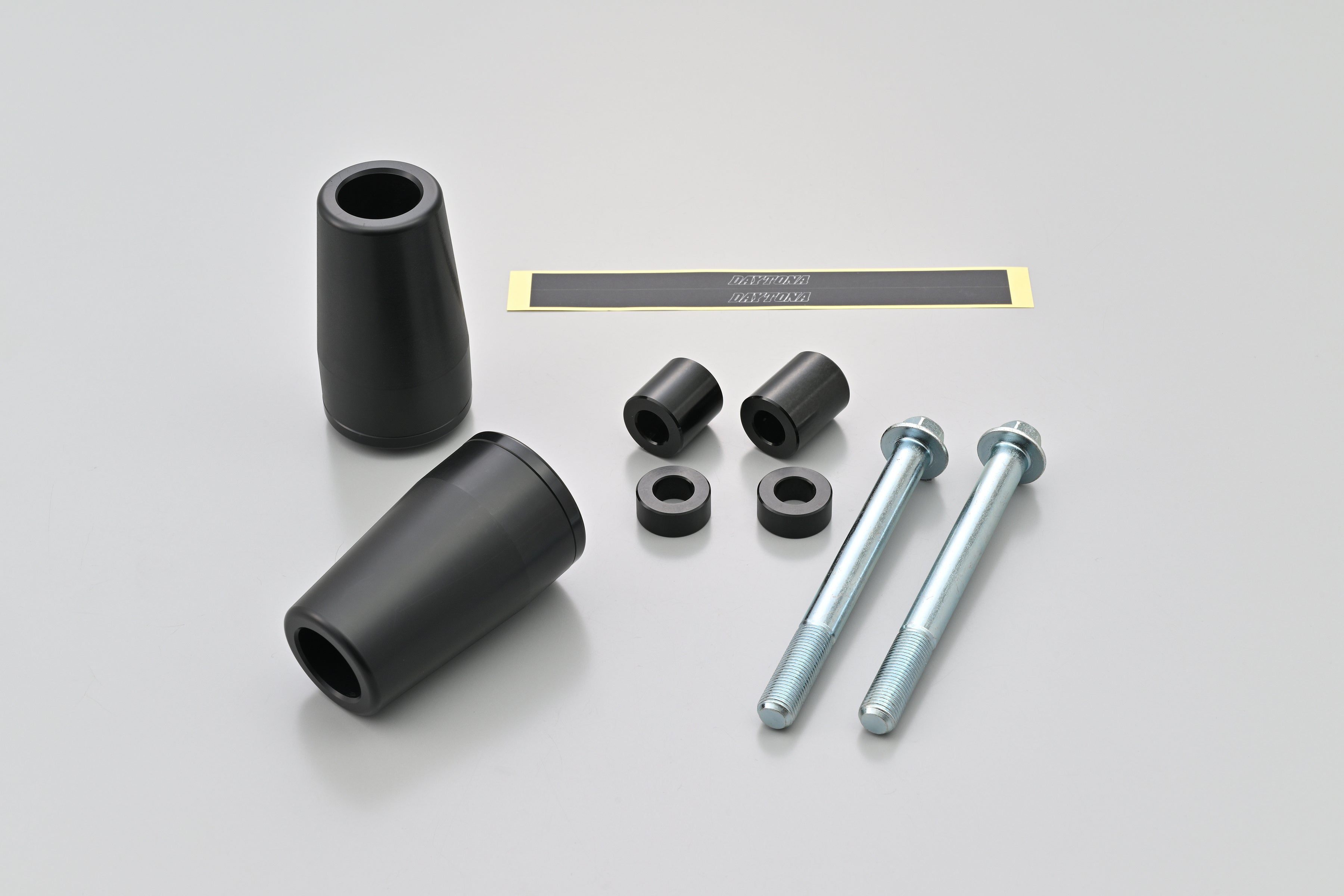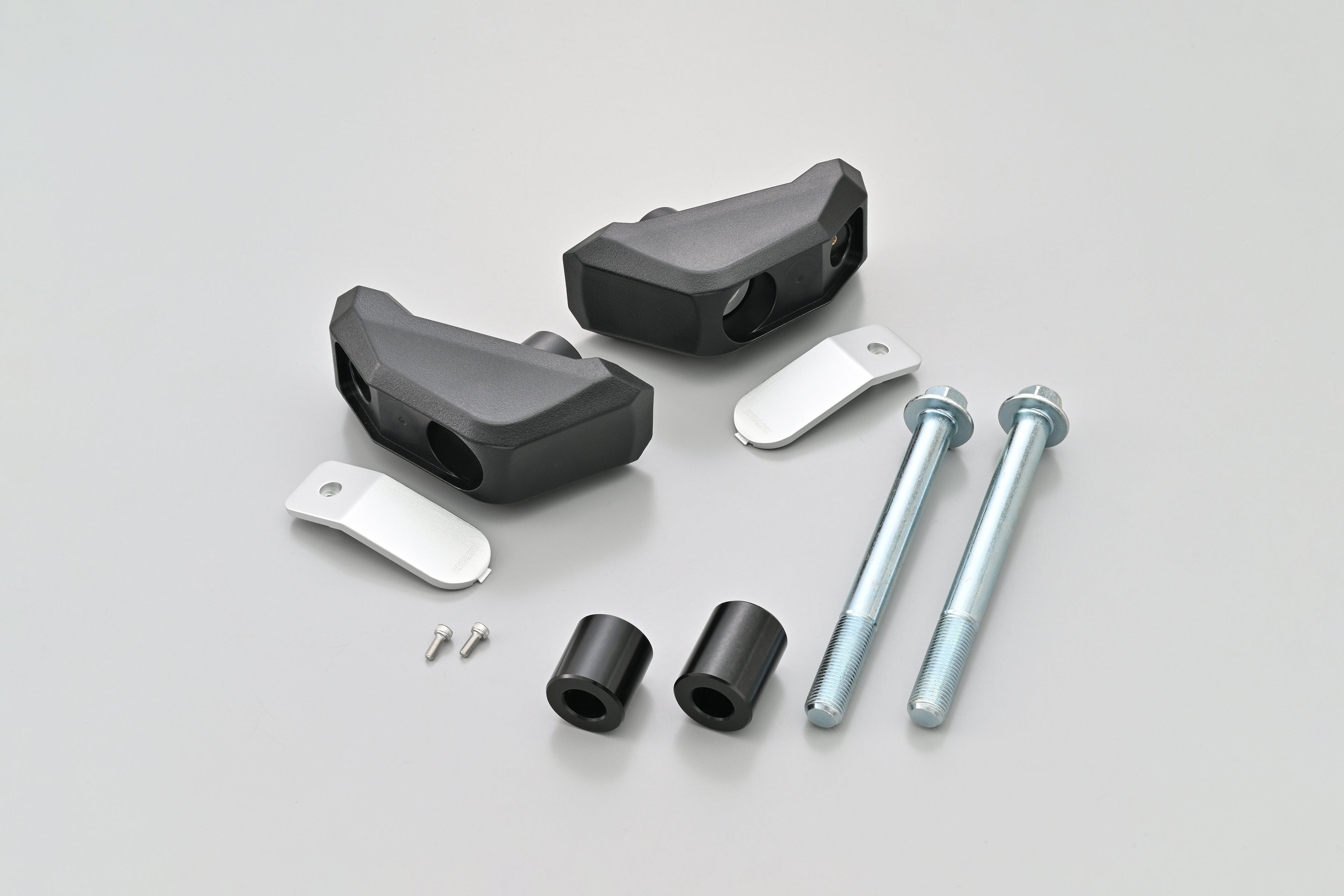 流線形の樹脂パッドが転倒時の衝撃を吸収しマシンへのダメージを緩和。アルミプレートは転倒時のボルト変形を防ぎ、機能とドレスアップを両立します。車種毎に適正な張り出し量を設定しています。左右セット。※当社エンジンガード(品番:62415)の同時装着が可能です。(意匠登録 No.D1762940)