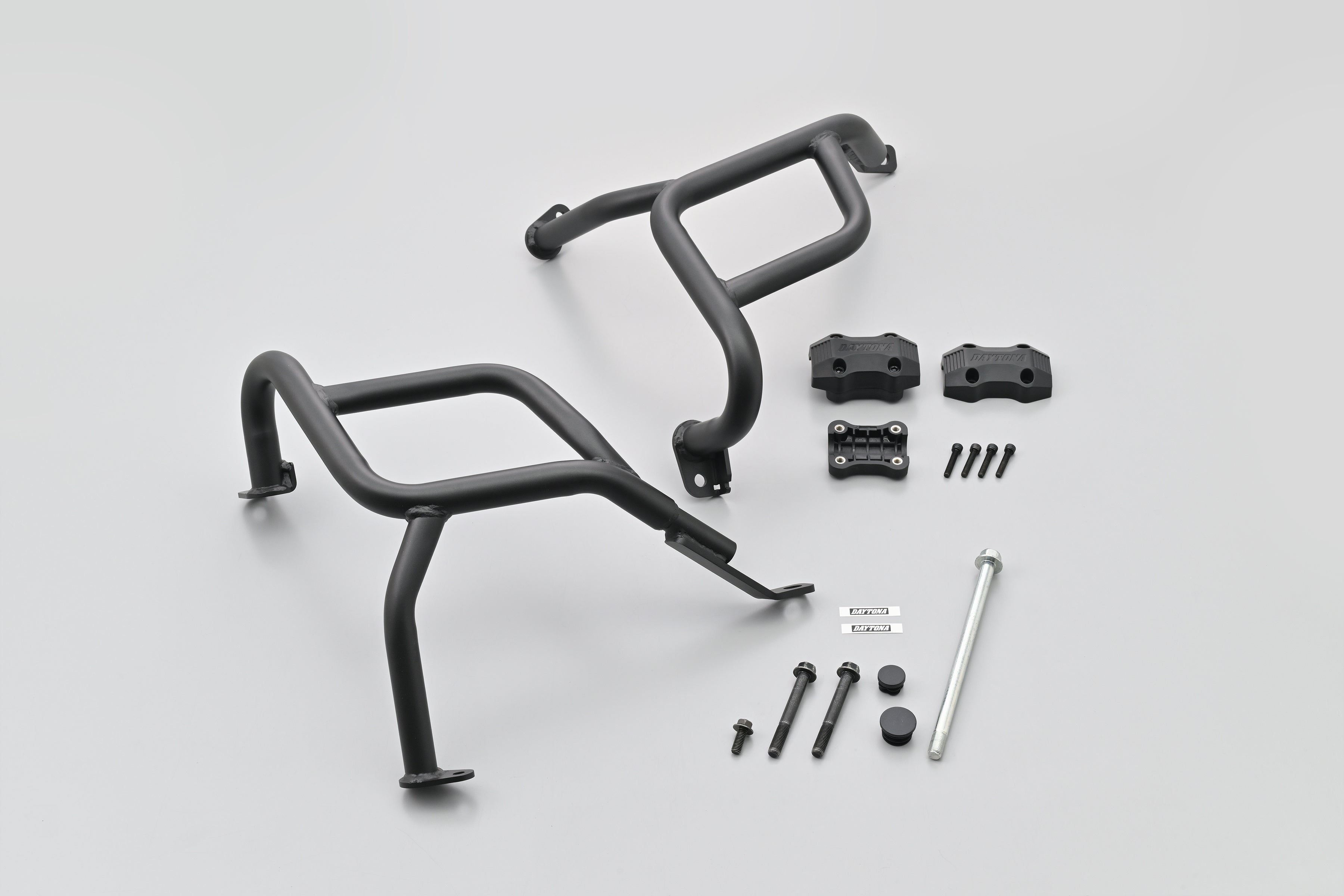 メインパイプは、車両のボリュームに負けないφ28.6の極太パイプで構成。強度の高い左右連結構造により、立ちごけなどの軽度な転倒による車体のダメージを軽減します。装着状態でオイルフィルターの脱着が可能です。フォグランプを装着する際の配線を留めるための切り欠きを設けるなど、細やかな心配りも特長です。樹脂パッド(リダクションスライダー)付属。※当社プレシャスレイLEDフォグランプキット スモール(48495)、W(40329)の同時装着が可能です。