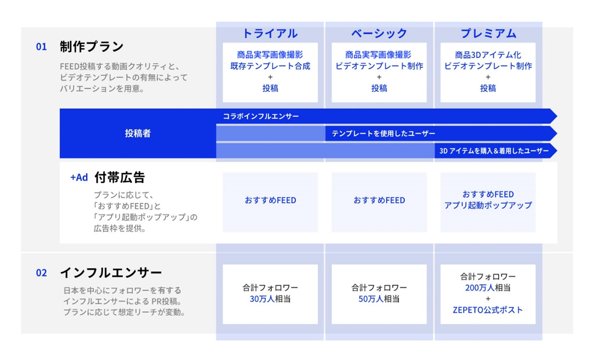 今回、新たに提供を開始するZEPETOを活用した国内初の広告パッケージ「Creator Collaboration Packages」では、メニューに応じてブランドのPRコンテンツを制作し、露出を拡大するための広告配信枠※5を提供します。