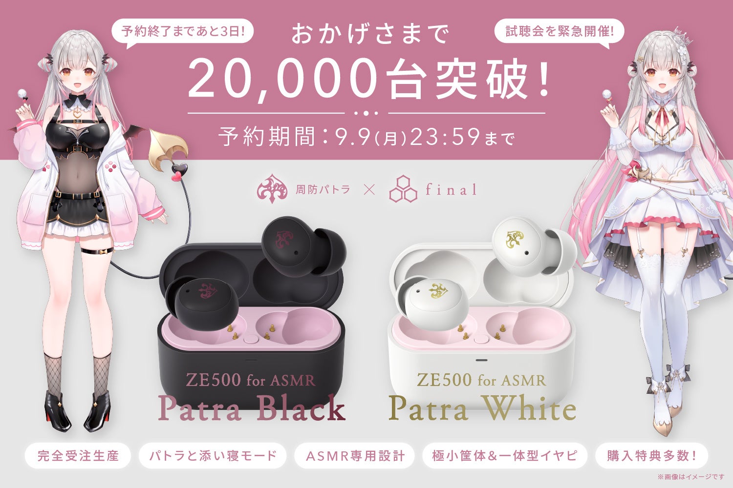 国内オーディオメーカー株式会社final(代表:細尾 満、本社:神奈川県川崎市)の自社ブランドfinalと、超大人気VTuber「周防パトラ」がコラボレーションした新モデル「ZE500 for ASMR -Patra Black/Patra White-」の予約数がおかげさまで20,000台を突破いたしました!