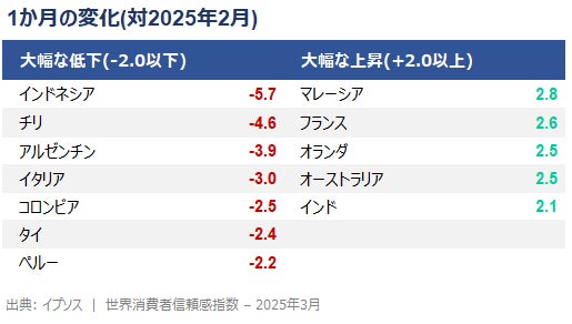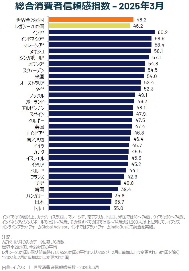 世界最大規模の世論調査会社イプソス株式会社(日本オフィス所在地:東京都港区、代表取締役:内田俊一)は、日本を含む世界29か国の75歳未満の21,000人以上を対象に実施された月次調査「イプソス世界消費者信頼感指数 2025年3月」を公開しました。