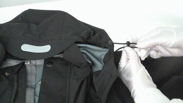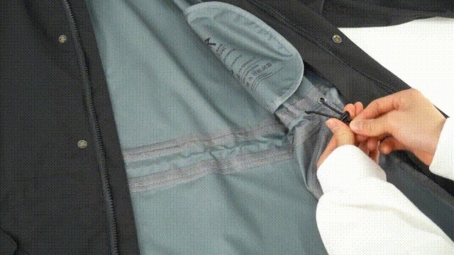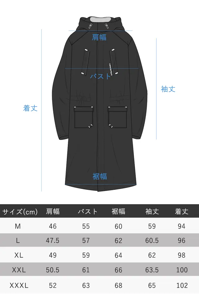 日本の雨の多い気候に適した、裾とフードのつばを長くした仕様です。口元は面ファスナーで、締め付けも自由に調整可能です。