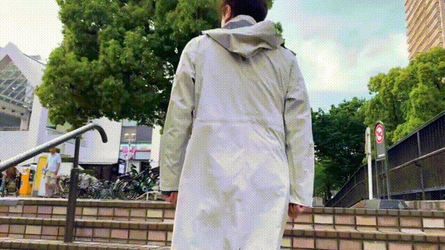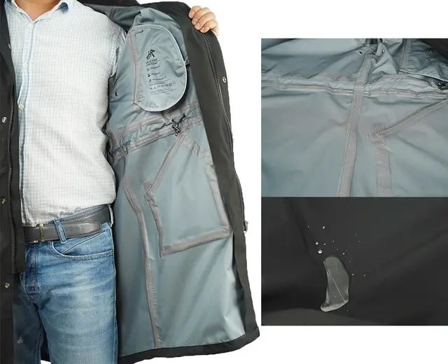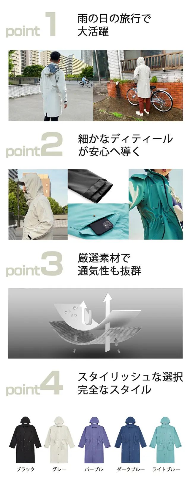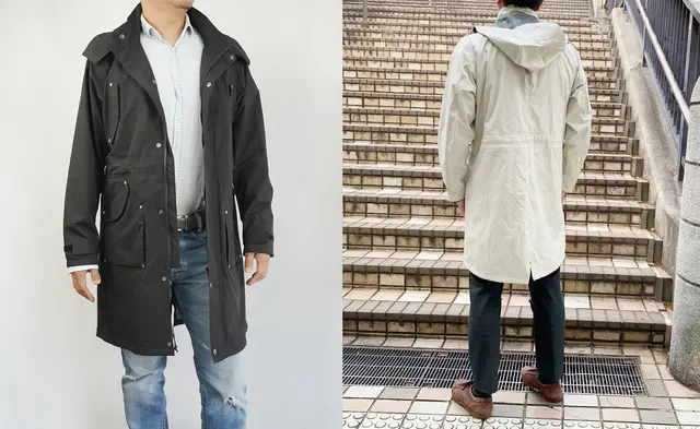 使い捨ての雨合羽や、雨天時にびしょ濡れのウインドブレーカーや大きな傘で周りをびしょびしょに濡らしたりせずに、スタイリッシュなレインコートでサッと脱いだら中の衣服は全く濡れていない、完全無欠なスタイルを演出できます。