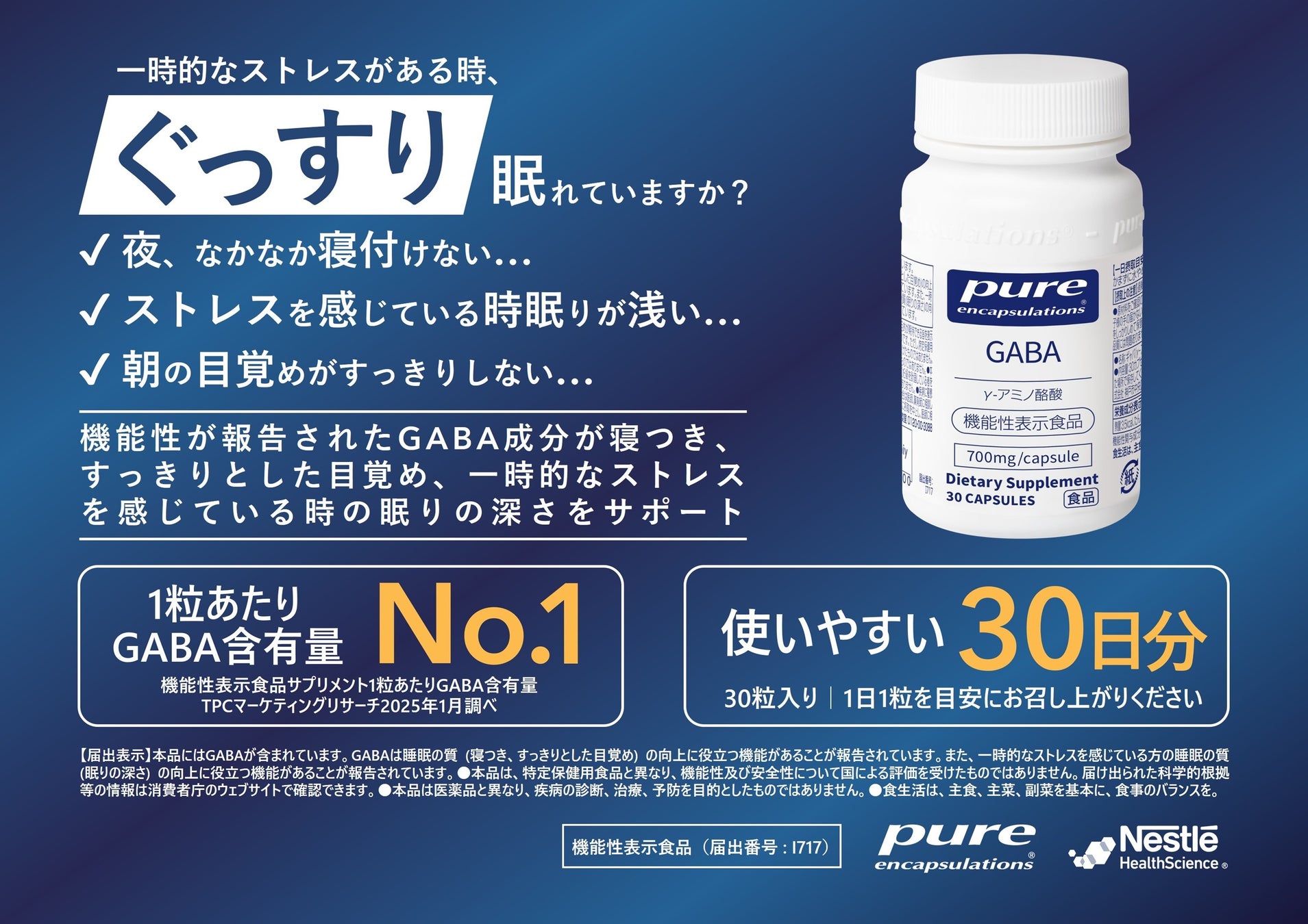 ネスレ日本株式会社 ネスレ ヘルスサイエンス カンパニー(本社:兵庫県神戸市、カンパニープレジデント:中島 昭広、以下「ネスレ ヘルスサイエンス」)は、2025年10月より、日本全国で調剤薬局を展開する日本調剤株式会社(本社:東京都港区、代表取締役社長:小城 和紀)を通じて、日本調剤の店舗およびオンラインストアにて、機能性表示食品のサプリメントにおける1粒あたりGABA含有量国内No.1※1のサプリメント「Pure Encapsulations(ピュア エンキャプスレーションズ) GABA 30粒入り」の販売を開始しました。
